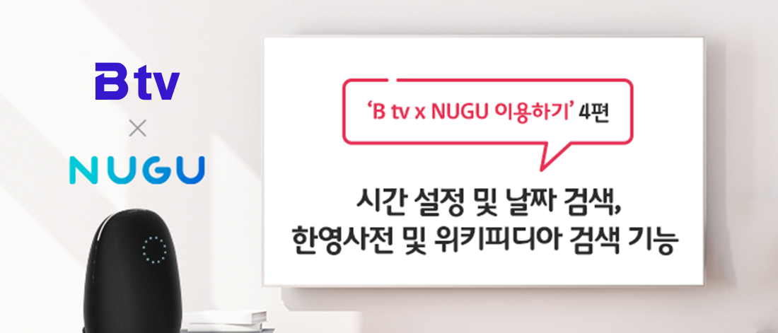 이번 B tv x NUGU 이용하기 4편에서는 시간 설정 및 날짜 검색, 한영사전 및 위키피디아 검색 기능을 살펴보았는데요.