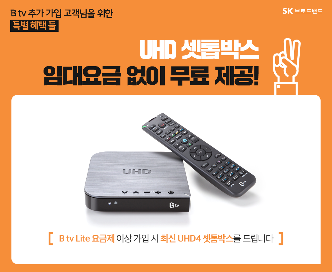 B tv Lite 요금제 이상 가입 시 최신 UHD4 셋톱박스를 드립니다. 😊