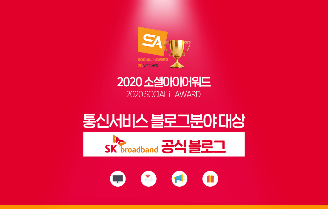 이번 2020 소셜아이어워드 통신서비스 블로그 분야에서 SK브로드밴드 공식 블로그가 자랑스럽게 대상을 차지하는 쾌거를 이루게 되었어요!