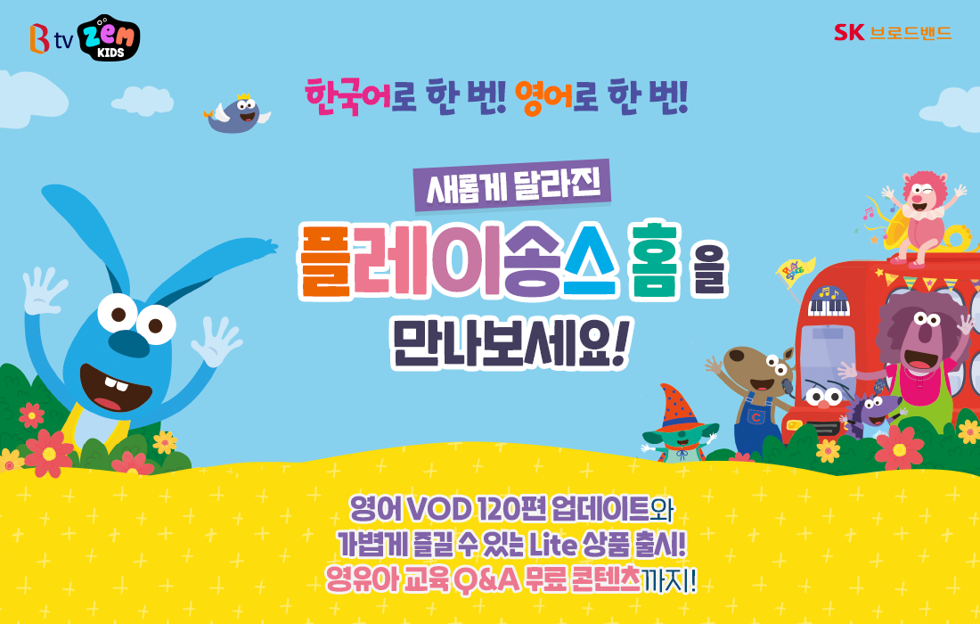 [플레이송스 홈 개편 소식] 한국어로 한 번! 영어로 한 번! B tv ZEM키즈에서 새로워진 플레이송스 홈을 만나보세요!