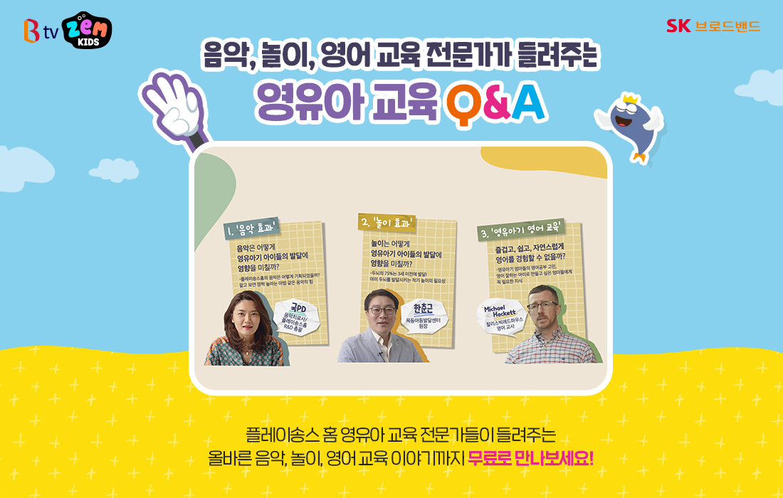 B tv ZEM키즈 플레이송스 홈에서는 음악, 놀이, 영어 교육 전문가가 들려주는 영유아 교육 Q&A 영상도 무료로 볼 수 있는데요.