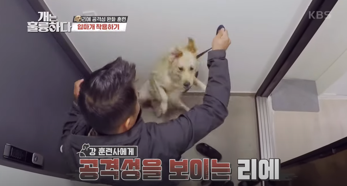 리에의 공격성을 낮추기 위해 강형욱이 제시한 훈련은 목줄 제어와 입마개 훈련이었습니다.