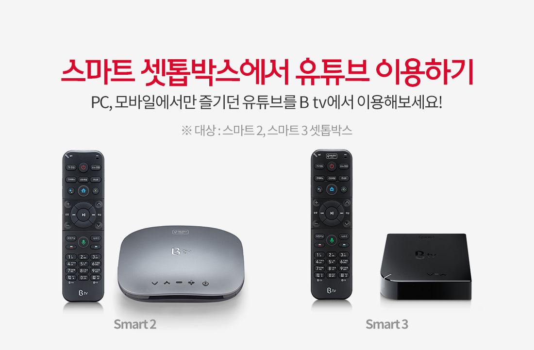 - 유튜브는 VOD와 실시간 채널 두 가지를 제공하나, B tv 셋톱박스 기종별 구글 안드로이드 OS 버전에 따라 스마트 1 셋톱박스에서는 VOD만 시청 가능합니다.