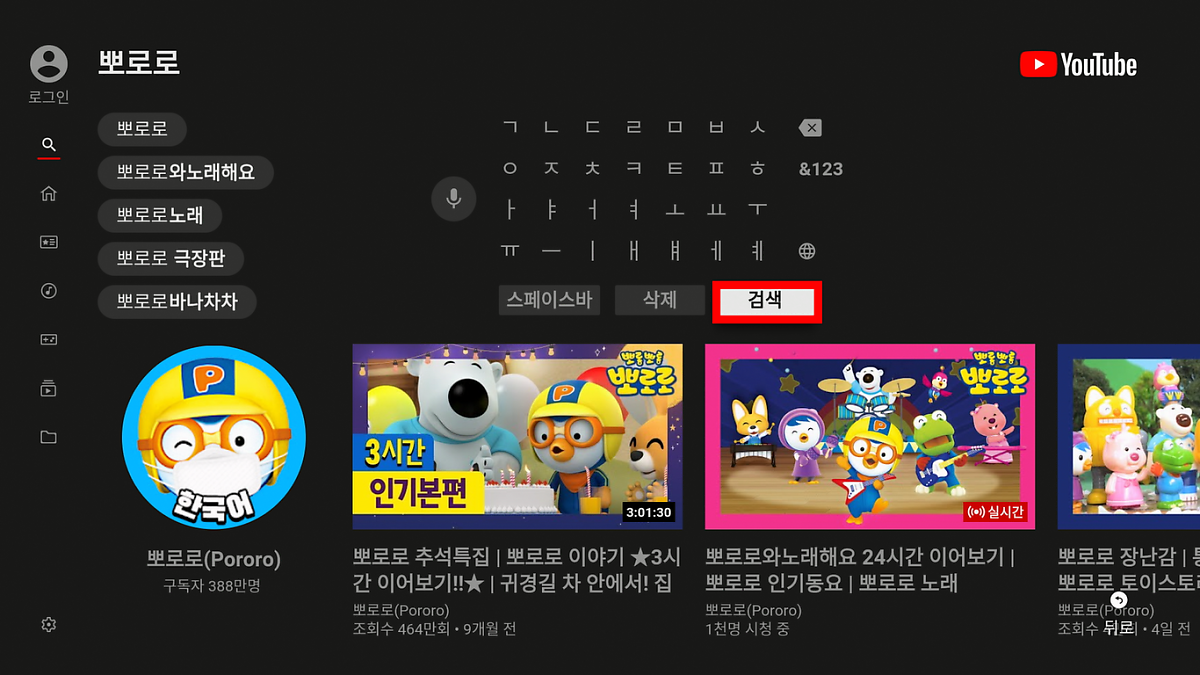 3. 리모컨의 오른쪽 방향키를 눌러 키패트로 이동하여 검색어를 입력한 뒤, 검색으로 이동 후 OK 버튼을 누릅니다.