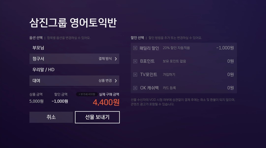 나는 이참에 TV로 할 수 있는 모든 효도를 해보기로 마음먹었다. 사실 처음엔 요금이 저렴하니까 그것으로 됐다 싶었는데 B tv 패밀리의 기능들을 살펴보고 나서 마음이 바뀐 것이다. 그중에서 VOD 선물하기가 눈에 띄었는데, 사실 보고 싶은 VOD가 있어도 우리 엄마 아빠는 돈이 아깝다며 구매하지 않으시고 또한 결제 방법도 잘 모른다. 그런데 내가 직접 VOD를 구매해 선물할 수 있다는 말에 구미가 확 당겼다. 심지어 유료 뿐만 아니라 무료 VOD도 선물 가능하다는 것!