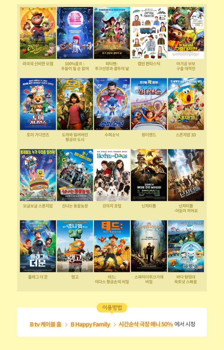 <100% 울프: 푸들이 될 순 없어>, <도라와 잃어버린 황금의 도시> 등 20가지가 최대 50% 할인된다는 사실. B tv 케이블 홈에서 ‘B Happy Family’ 메뉴의 ‘시간순삭 극장 애니 50%’에서 시청하세요! ^-^