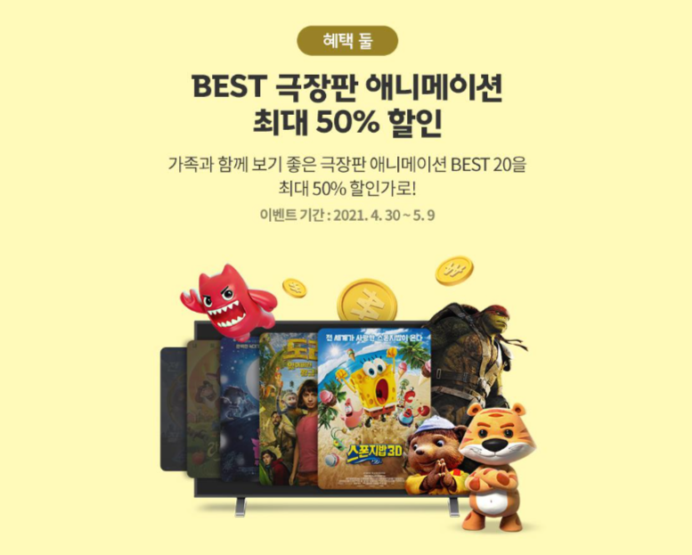 5월 9일까지 가족 영화와 극장판 애니메이션 VOD를 할인가로 감상하실 수 있답니다.