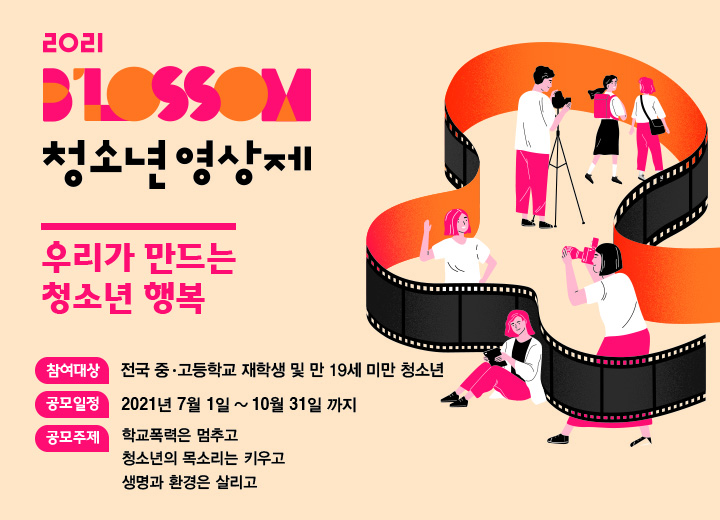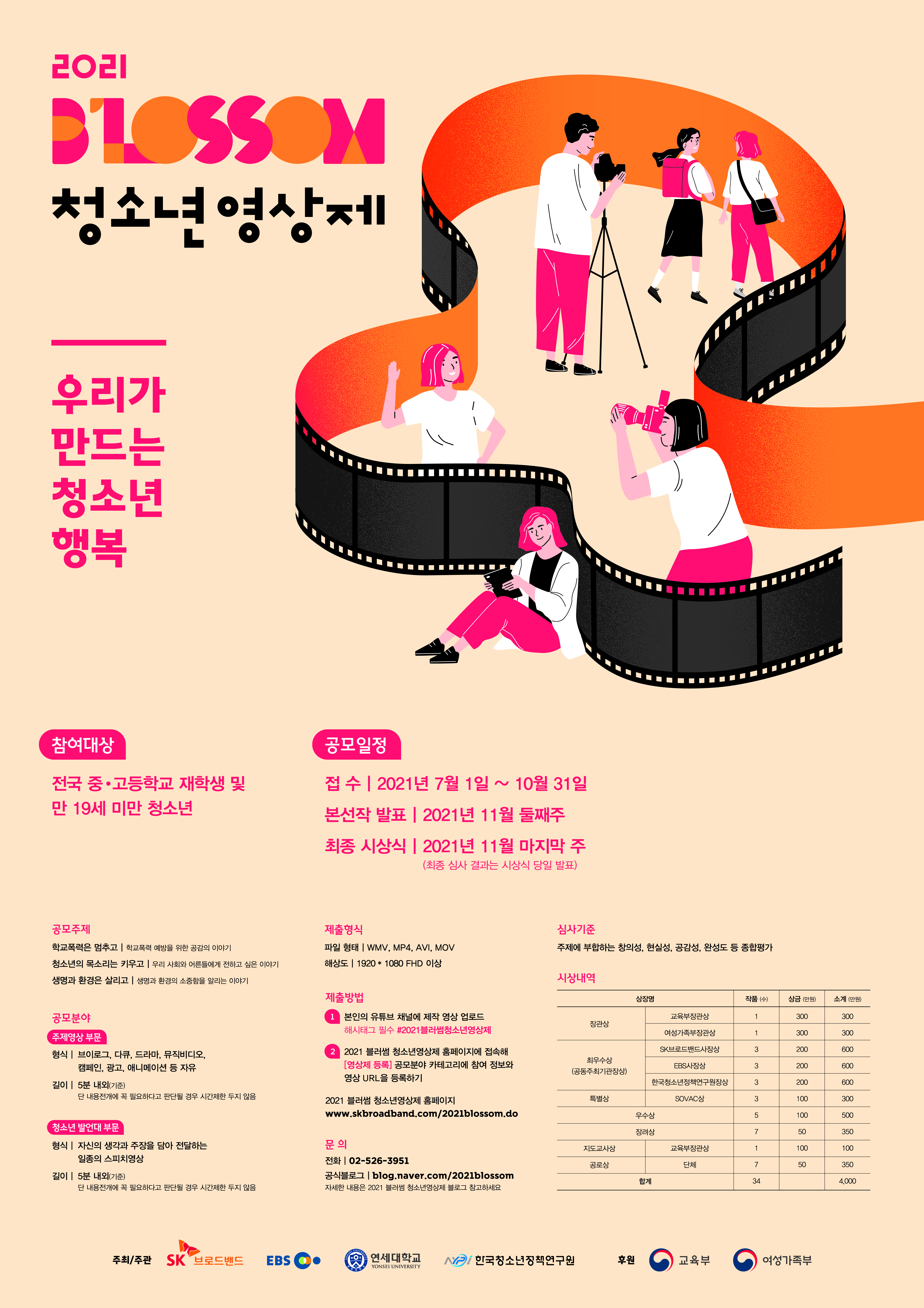 EBS, 연세대학교, 한국청소년정책연구원과 함께 공동 주최하고 교육부와 여성가족부가 후원하는 ‘2021 블러썸 청소년영상제’에서 여러분의 목소리를 들려주세요!