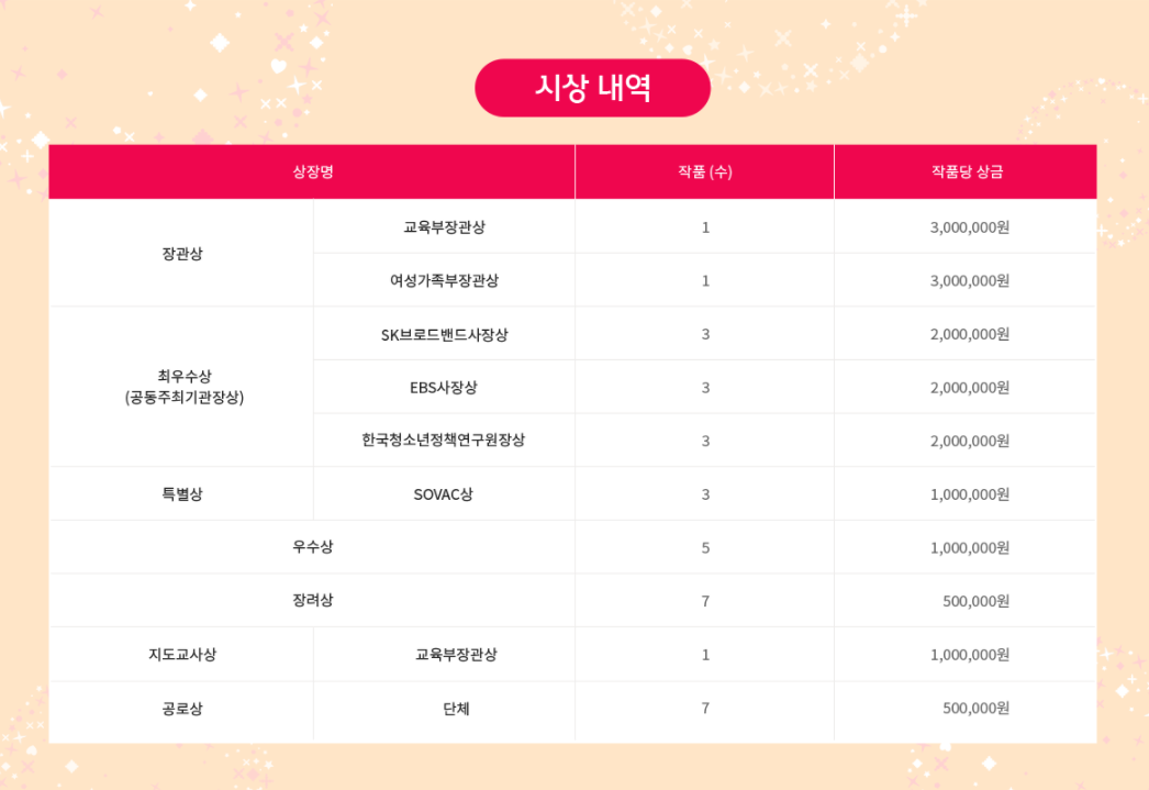 또한, 공동 주최사들과 협력을 통해 만들어지는 영상 공모전인 만큼, 총 34개 부문에서 시상을 진행합니다. 작품당 상금도 빵빵하니 청소년 여러분의 많은 참여 부탁드립니다! 😊