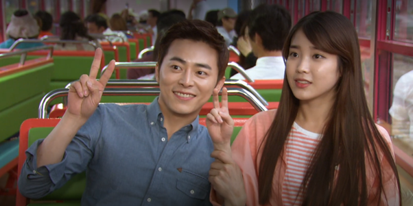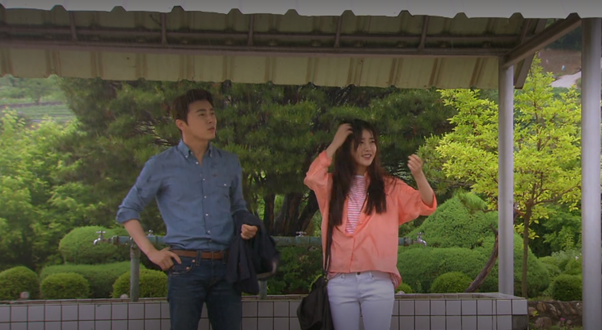 관광 중 갑작스럽게 비가 내리자 수돗가로 몸을 피한 '신준호'(조정석)와 '이순신'(아이유).