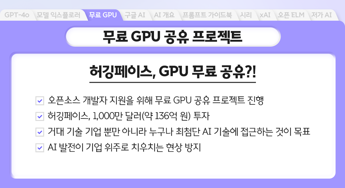 1. Summary: 허깅페이스가 오픈소스 개발자 지원을 위해 누구나 사용할 수 있는 GPU 무료 공유 프로젝트에 1000만달러(약 136억원)를 투자한다.