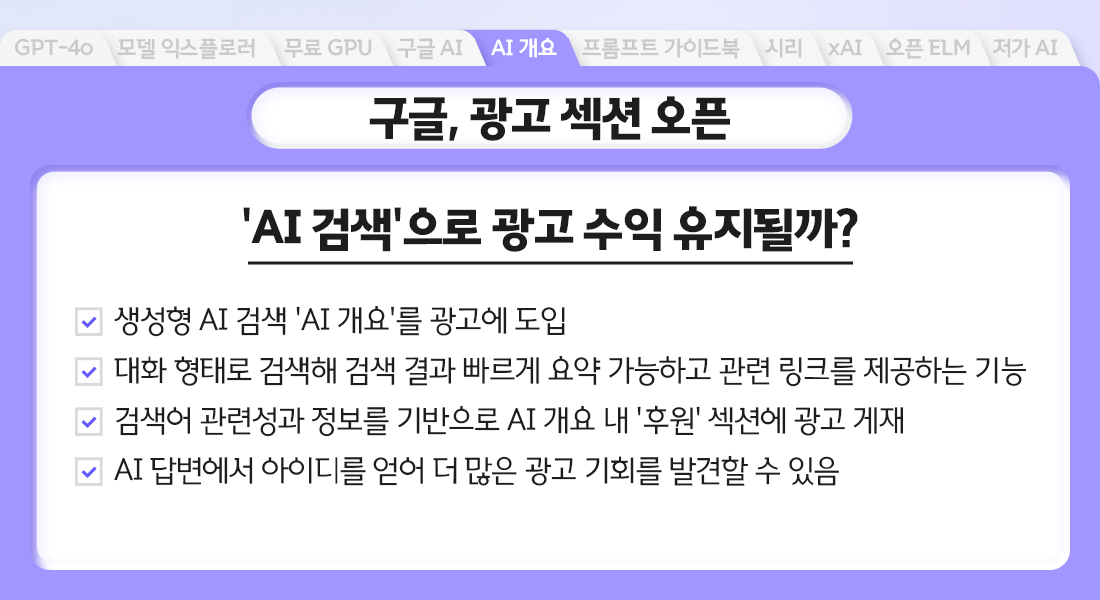 1. Summary: 구글이 생성 인공지능 검색 ‘AI 개요(AI Overview)’에 광고를 도입했다.