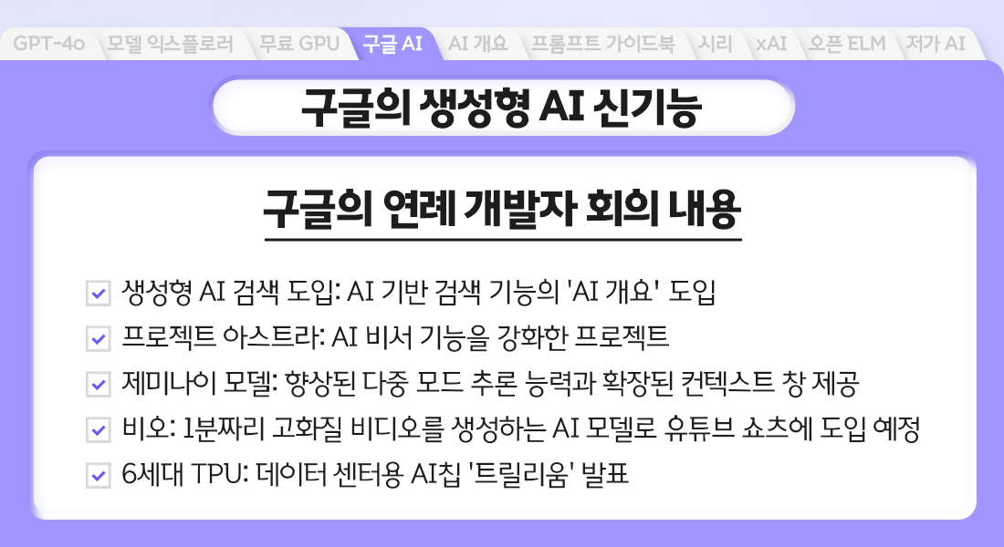 - 프로젝트 아스트라: AI 비서 기능을 강화한 프로젝트로, 휴대폰 카메라를 통해 주변 상황을 파악하고 음성으로 정보를 제공하는 AI 에이전트 출시 예정.