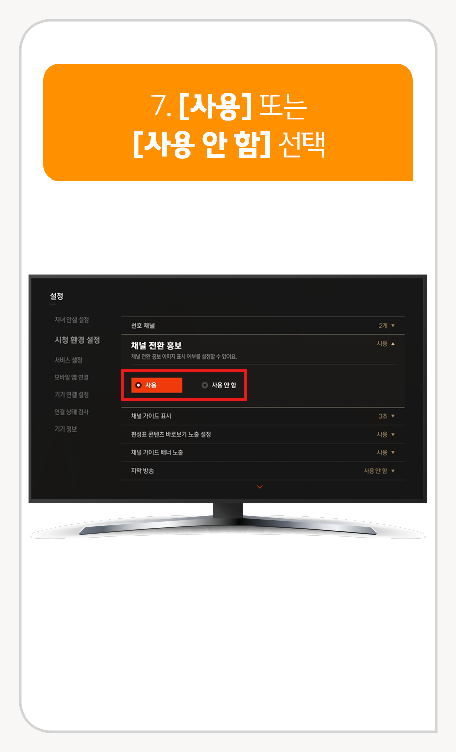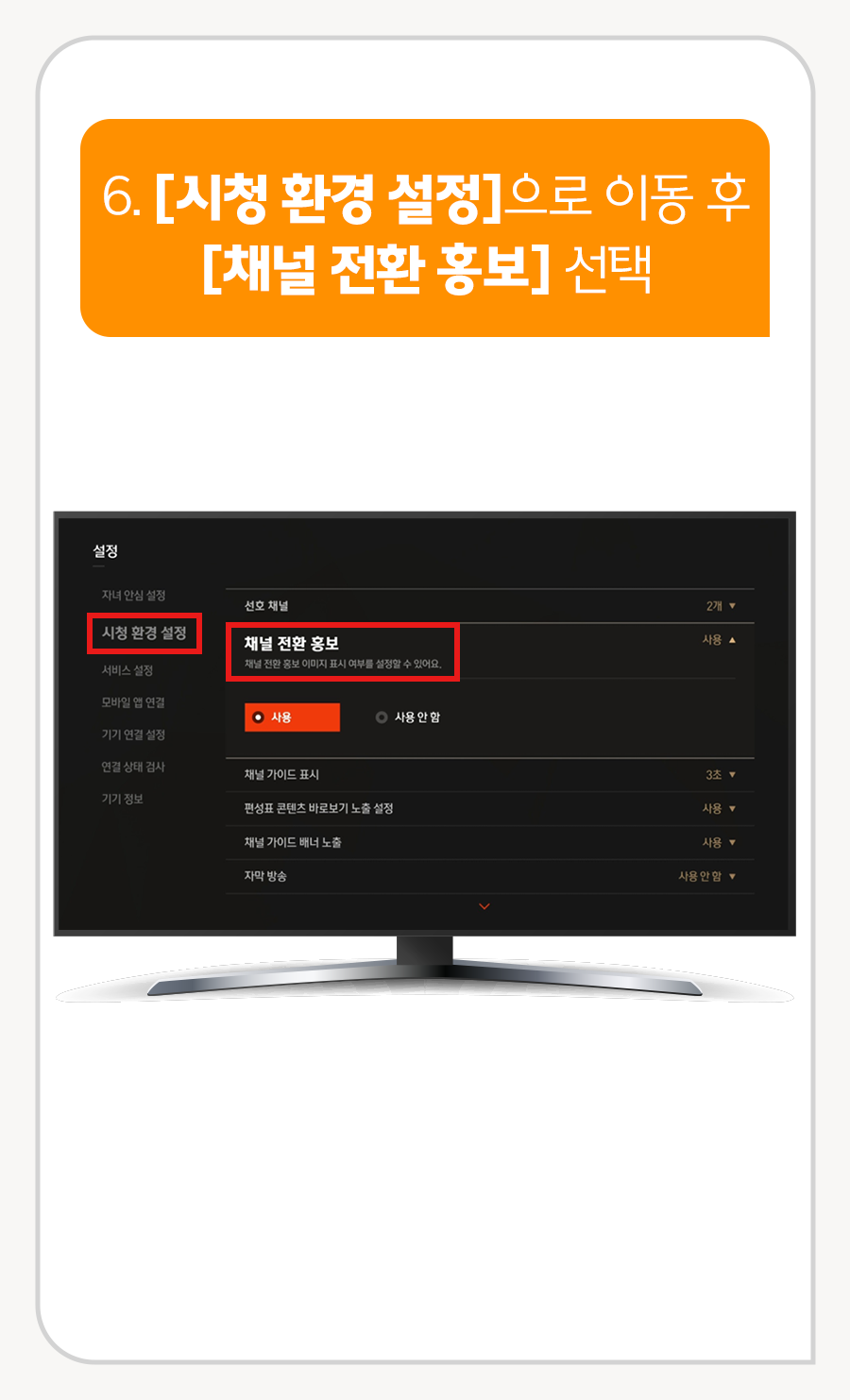 6. [시청 환경 설정]으로 이동 후 [채널 전환 홍보] 선택