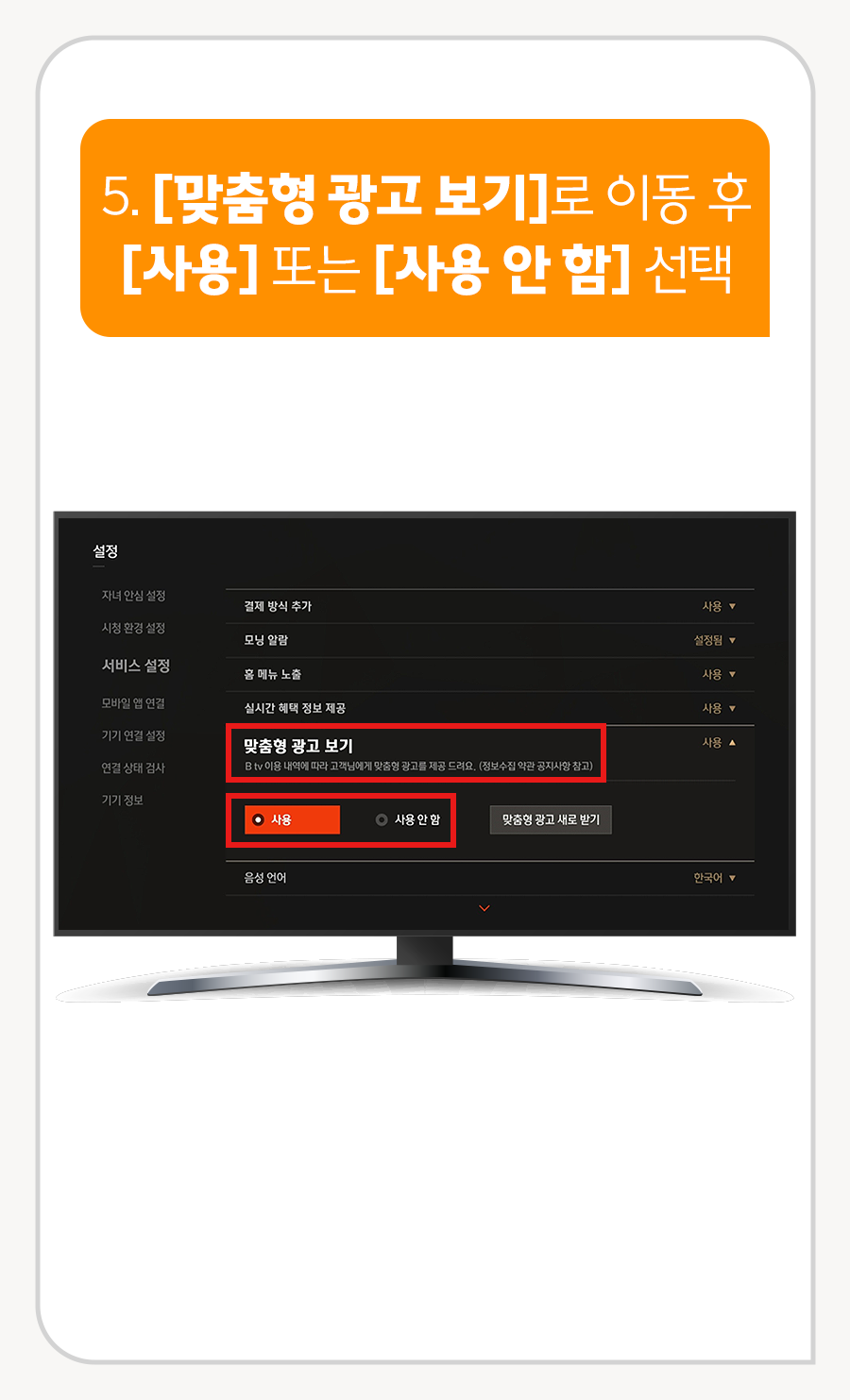 5. [맞춤형 광고 보기]로 이동 후 [사용] 또는 [사용 안 함] 선택