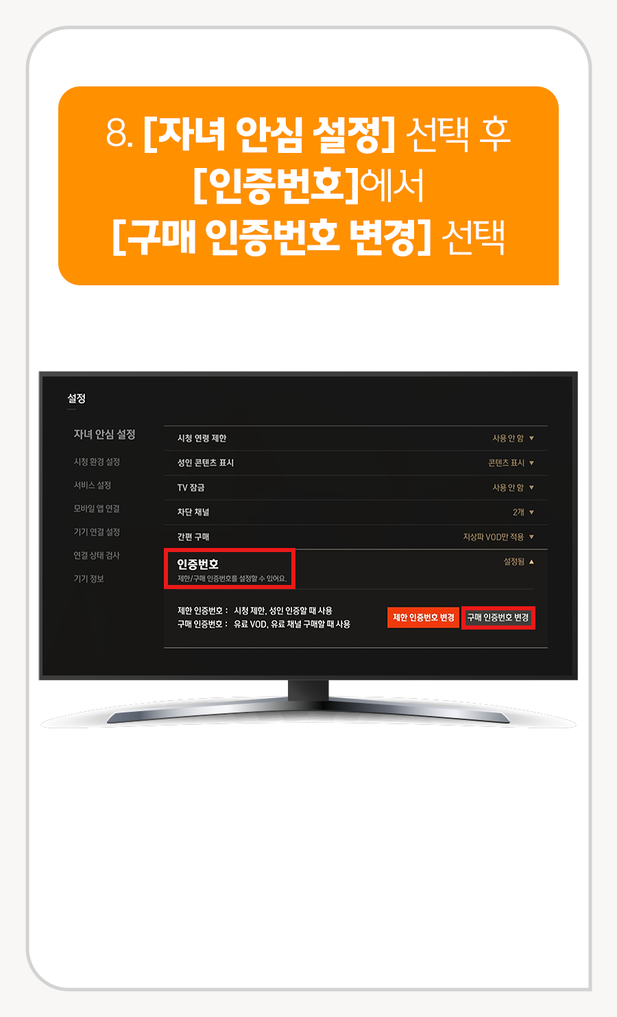 8. [자녀 안심 설정] 선택 후 [인증번호]에서 [구매 인증번호 변경] 선택