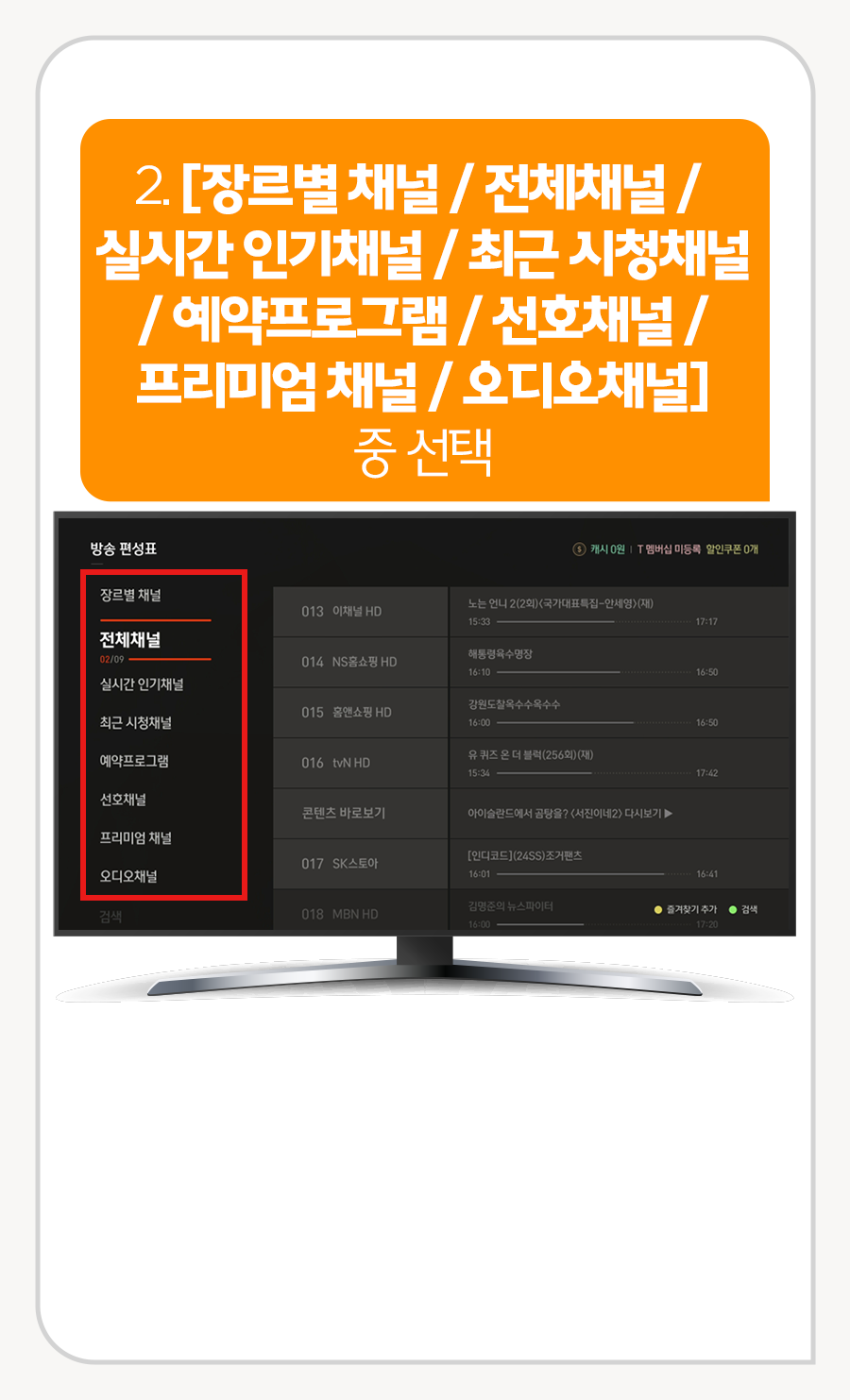 2. 장르별 채널/ 전체 채널/ 실시간 인기채널/ 최근 시청채널/ 예약 프로그램/ 선호채널/ 프리미엄 채널/ 오디오 채널 중 선택