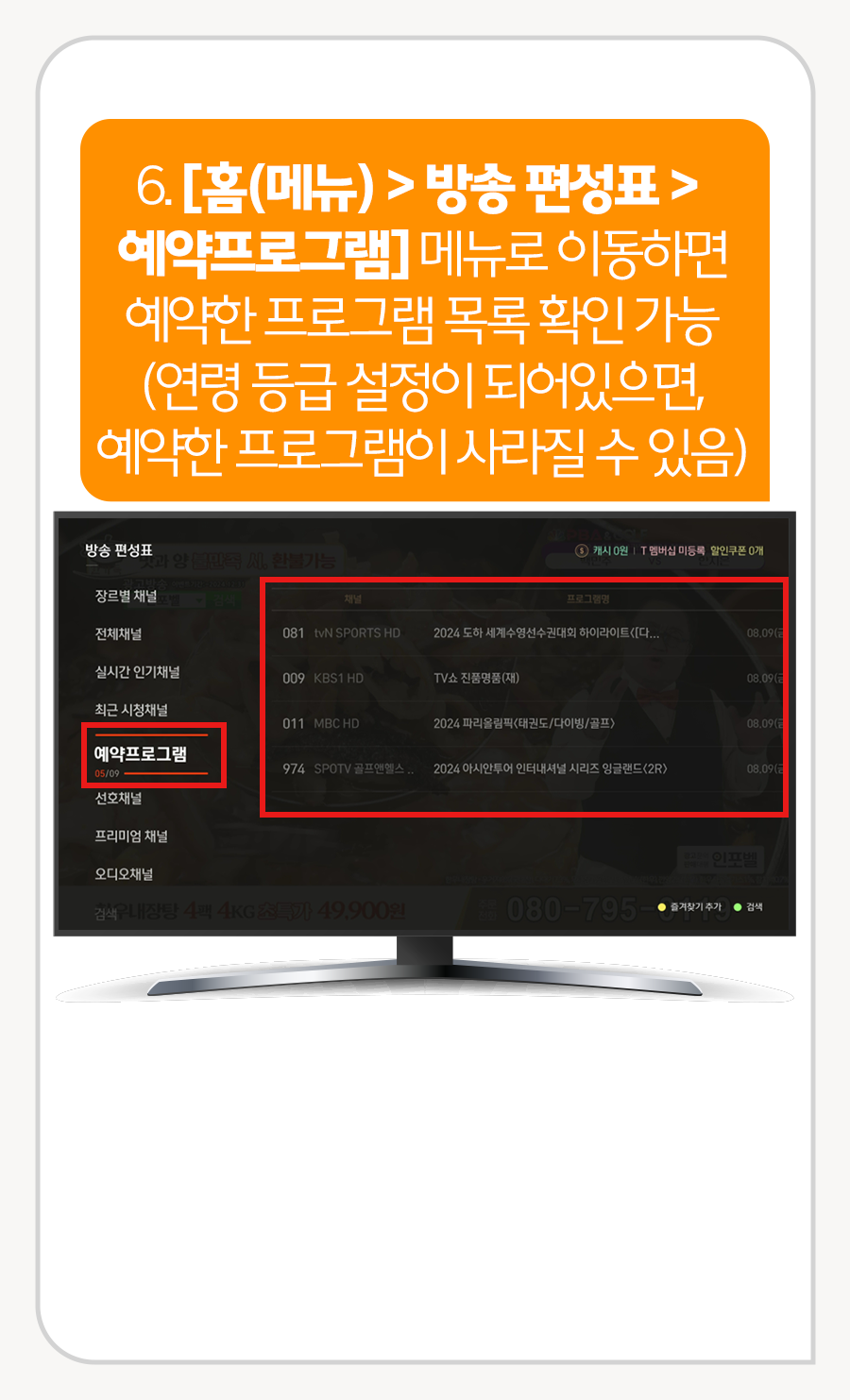6. 예약 프로그램 목록 확인: [홈(메뉴)] > 방송 편성표 > 예약프로그램