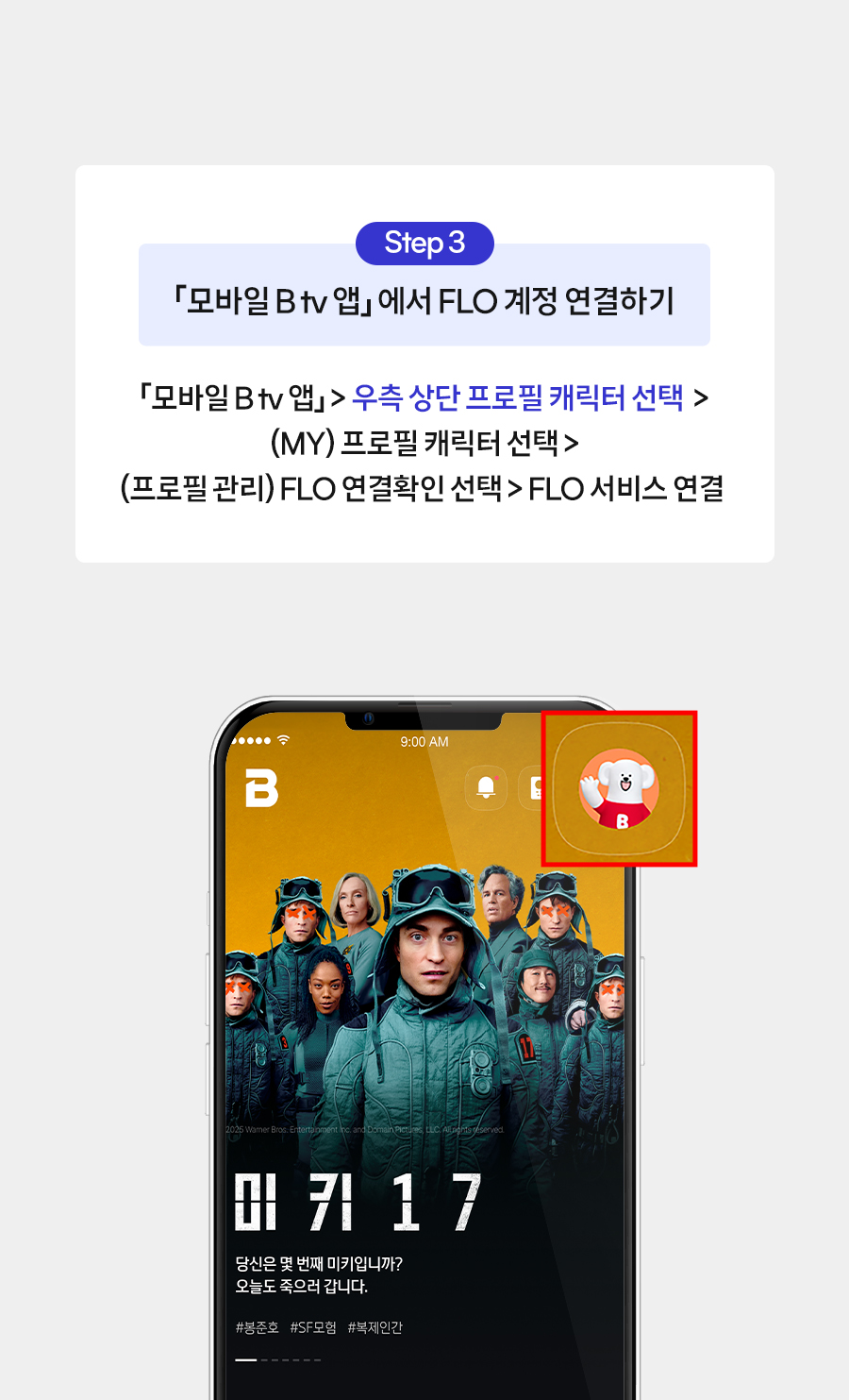 「모바일 B tv 앱」 > MY > 프로필 관리 > FLO 연결확인 > FLO 계정 연결 버튼 선택