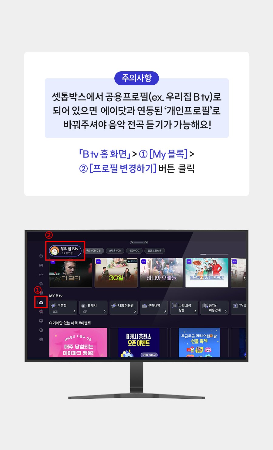 [B tv 홈 화면] >① [MY 블록] > ② [프로필 변경하기] 버튼 클릭