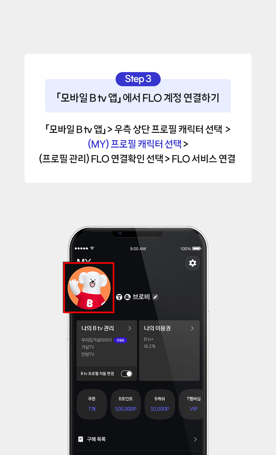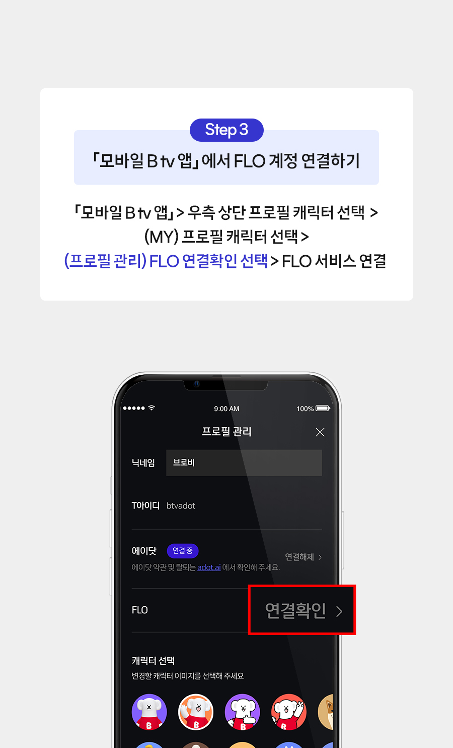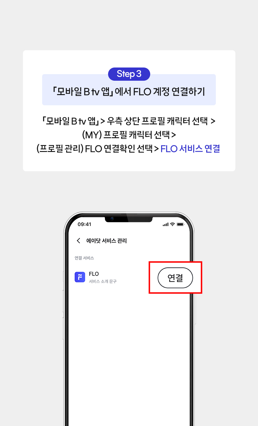 「모바일 B tv 앱」 > MY > 프로필 관리 > FLO 연결확인 > FLO 계정 연결 버튼 선택