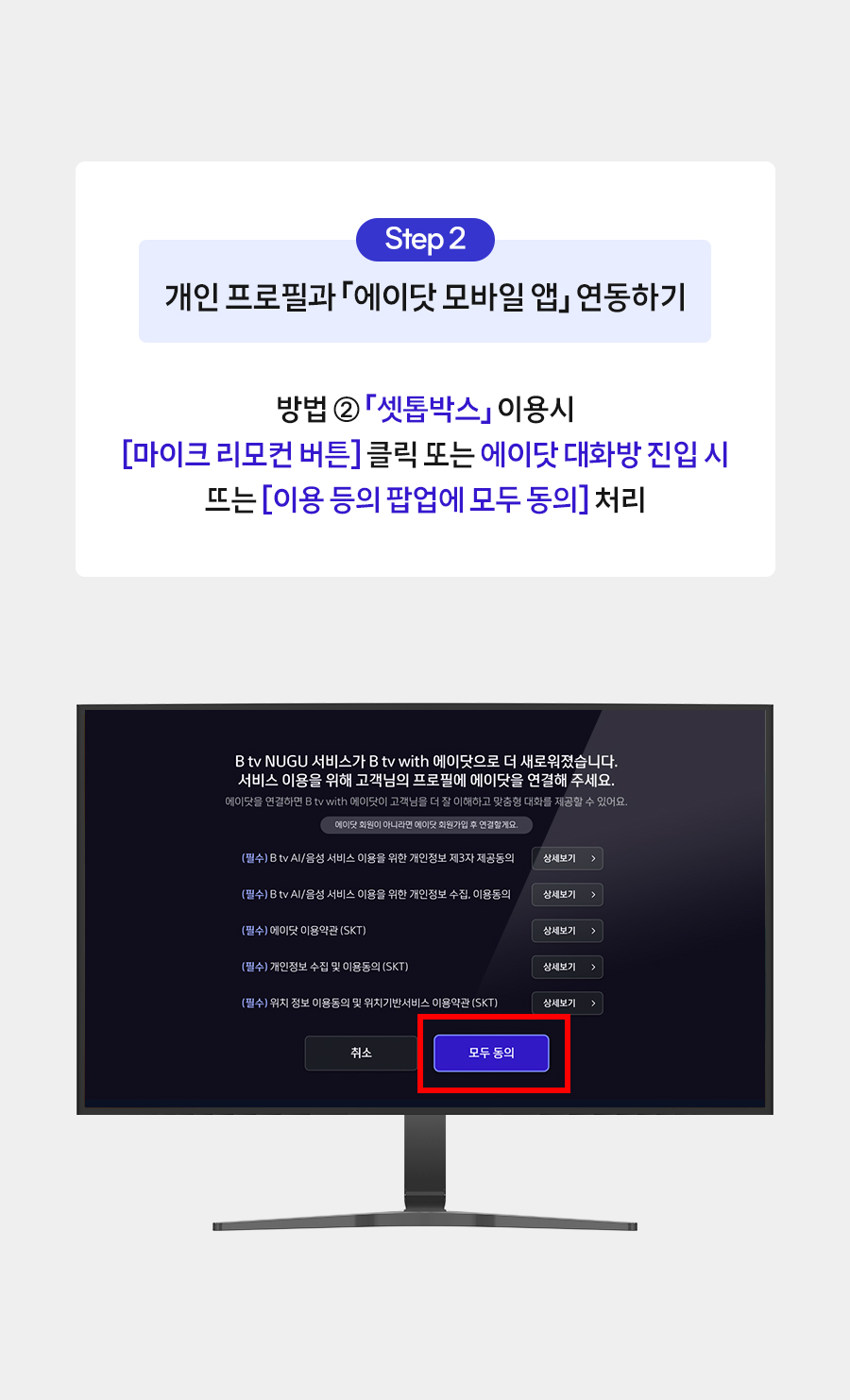 *'에이닷 연결하기' 버튼이 보이지 않을 경우, 플레이스토어/앱스토어에서 '모바일 B tv' 앱을 최신 버전으로 업데이트한 후 재시도 해주세요.