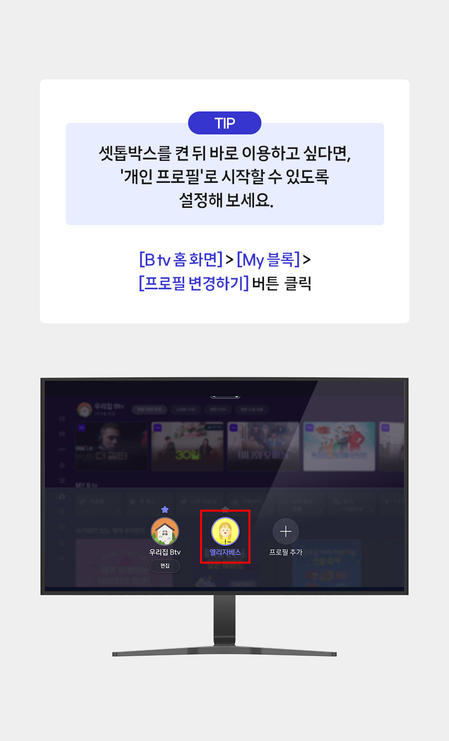 셋톱박스를 켠 뒤 바로 이용하고 싶다면, '개인 프로필'로 시작할 수 있도록 설정해 보세요.
