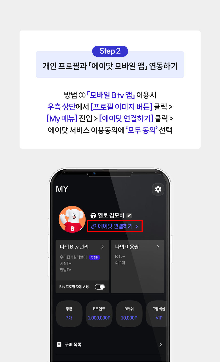 모바일 B tv 앱 우측 상단 [프로필 이미지 버튼] 클릭 > [My 메뉴] 진입 > ['에이닷 연결하기' 버튼] 클릭 > 에이닷 서비스 이용동의에 '모두동의' 선택
