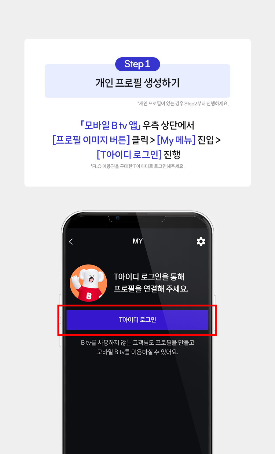 「모바일 B tv 앱」 에서 'FLO 이용권을 구매한 T아이디'로 개인프로필을 만들어주세요.