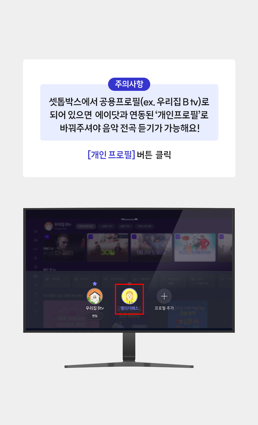 셋톱박스에서 공용프로필(ex. 우리집 B tv)로 되어 있으면