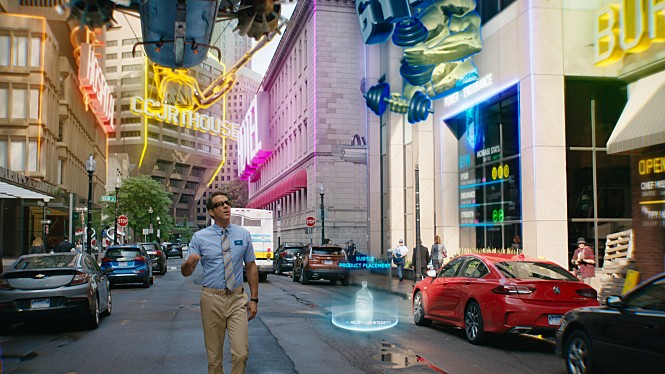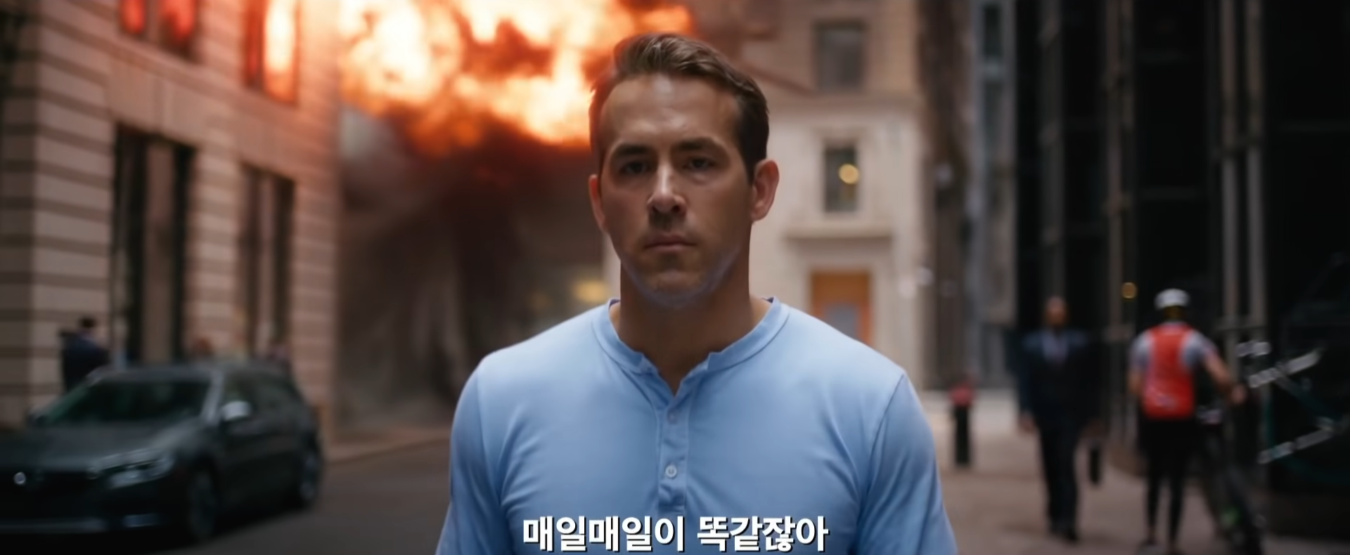 총격전이 난무하고 길거리에 탱크가 지나다니는 것이 당연한 ‘프리 시티’에 사는 ‘가이’(라이언 레이놀즈).