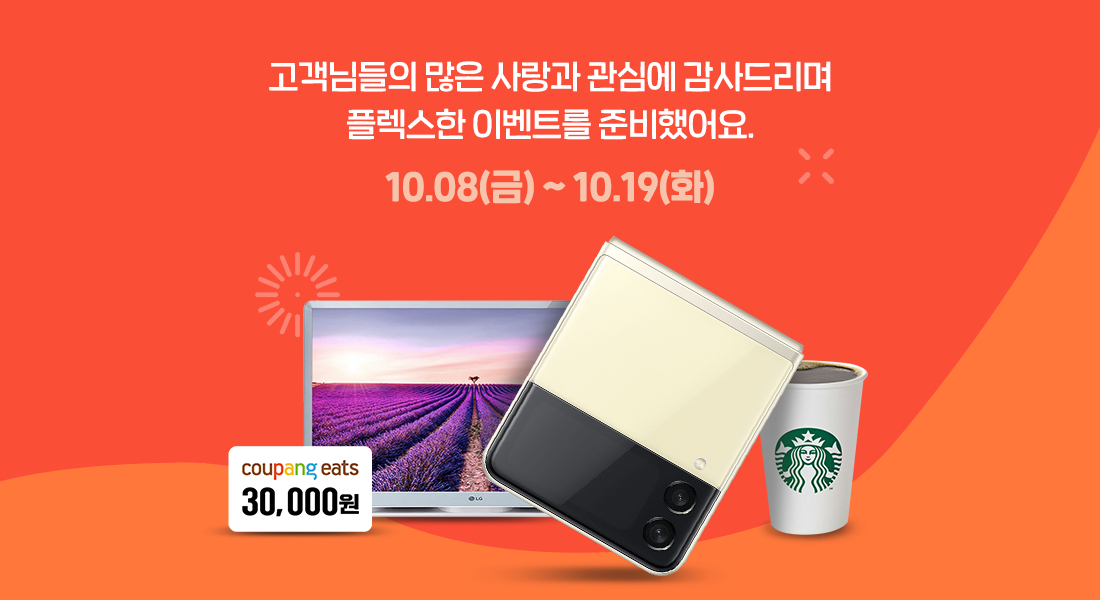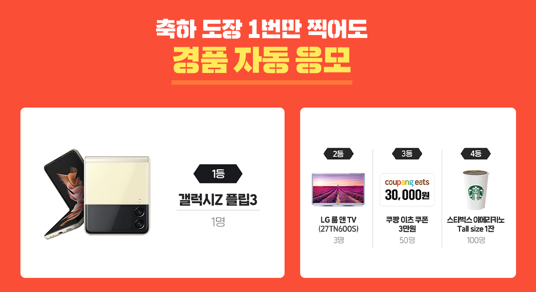갤럭시Z 플립3, LG 룸 앤 TV, 쿠팡 이츠 쿠폰 등 다양한 선물이 준비되어 있습니다.