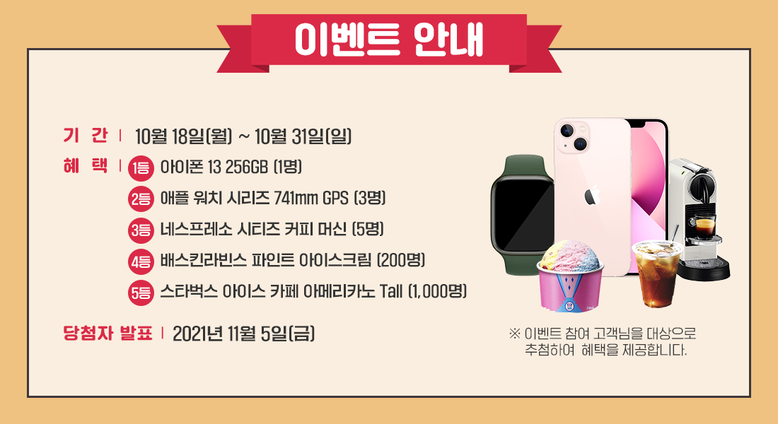 아이폰 13, 애플 워치, 네스프레소 커피 머신 등 다양한 상품이 준비되어 있습니다.