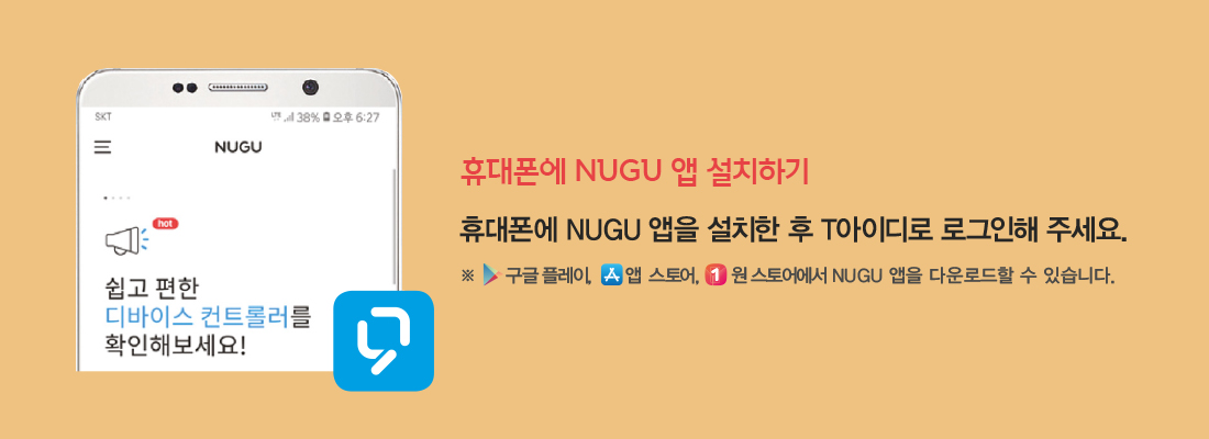 구글 플레이, 앱스토어, 원 스토어 등에서 고객님의 스마트폰에 NUGU 앱을 설치해주세요.