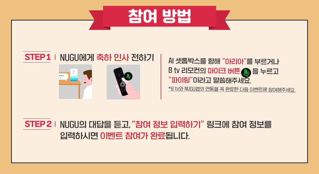 감사 이벤트에 참여하기 위해서 NUGU 앱과 B tv 셋톱박스 연결이 필요한데요.
