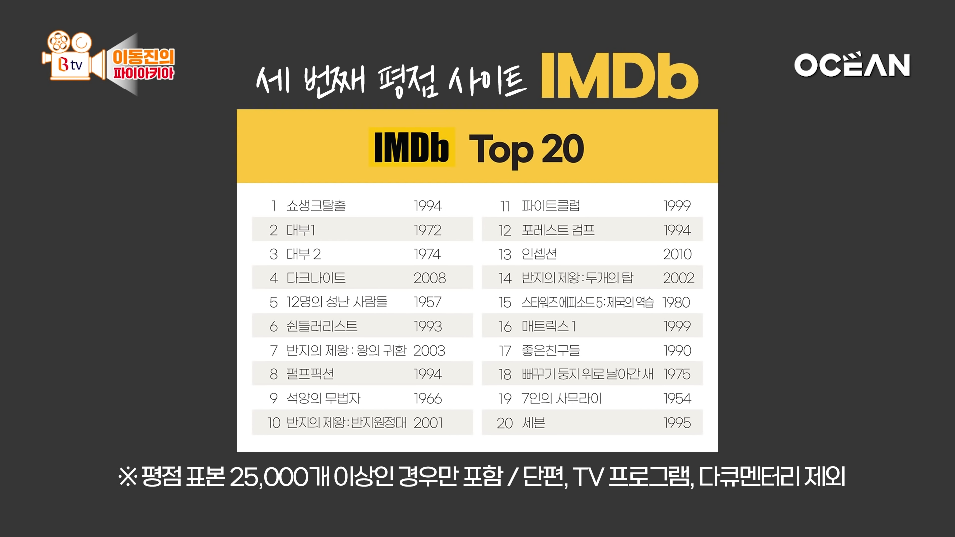 ‘B tv 이동진의 파이아키아’에서는 국내외 대표적인 영화 평점 사이트에서 최고의 평점을 받은 Top 20의 작품들을 선정해보았는데요.
