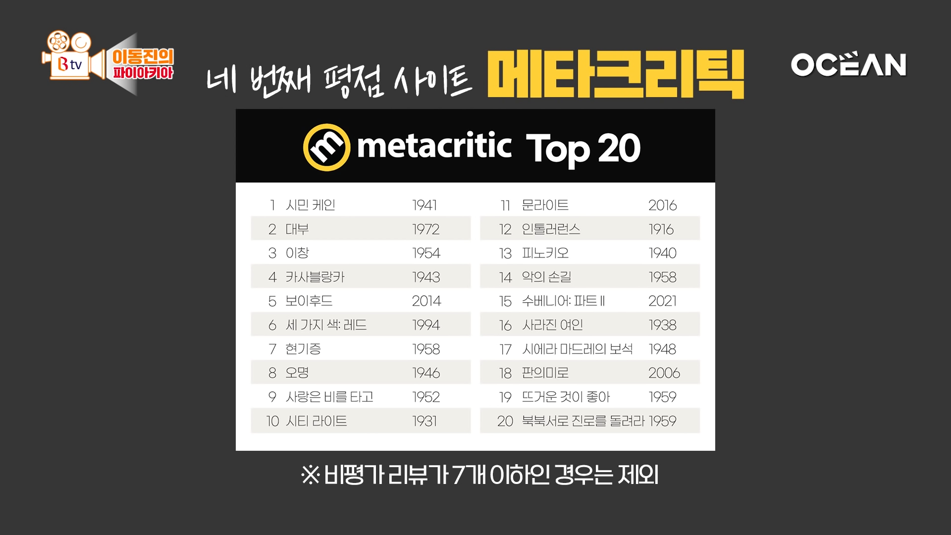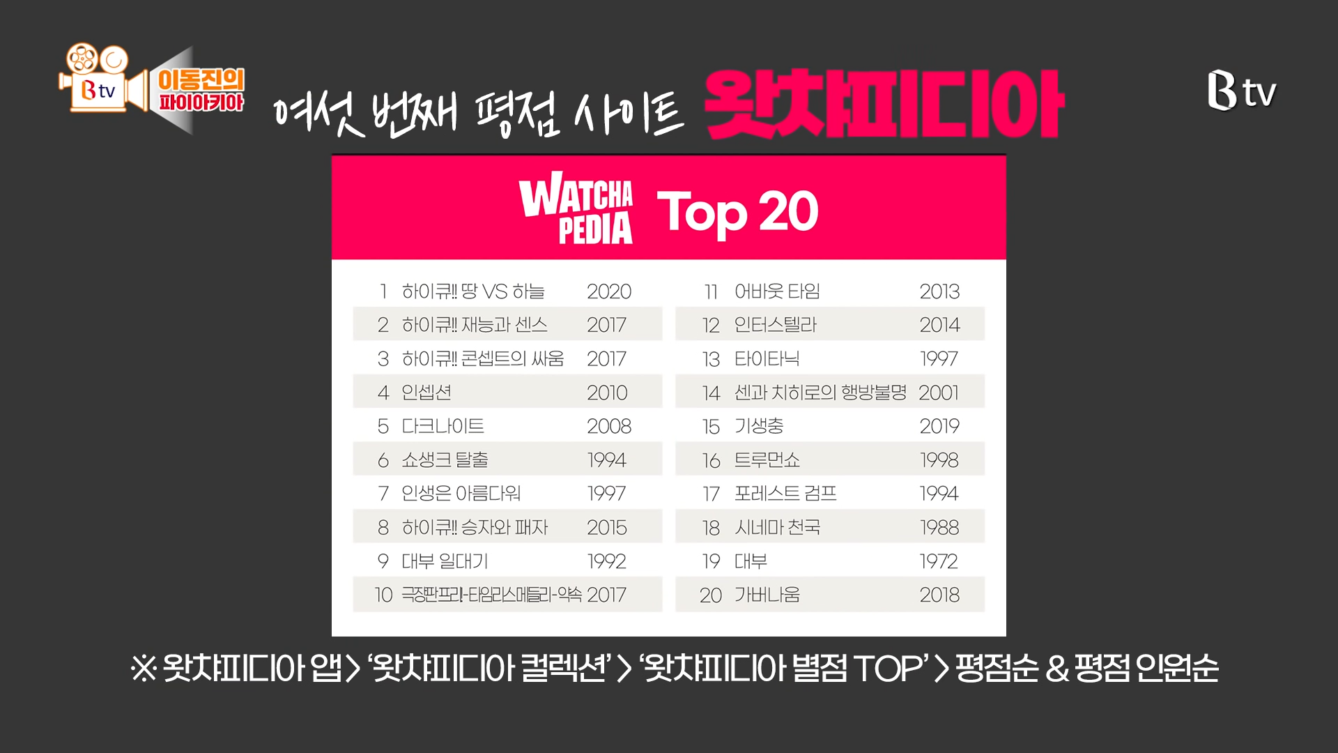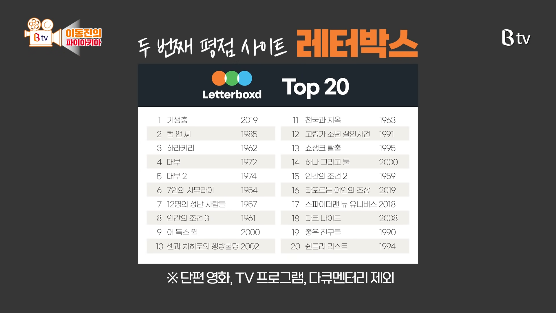 ‘B tv 이동진의 파이아키아’에서는 국내외 대표적인 영화 평점 사이트에서 최고의 평점을 받은 Top 20의 작품들을 선정해보았는데요.