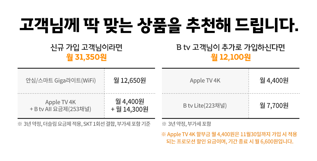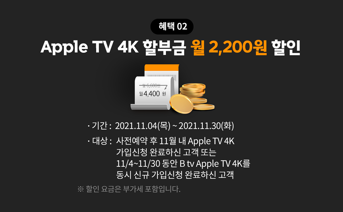 11월 내에 B tvApple TV 4K를 동시 신규 가입신청 완료하신 고객님들께 월 6,600원인 할부금을 2,200원 할인해 드립니다.
