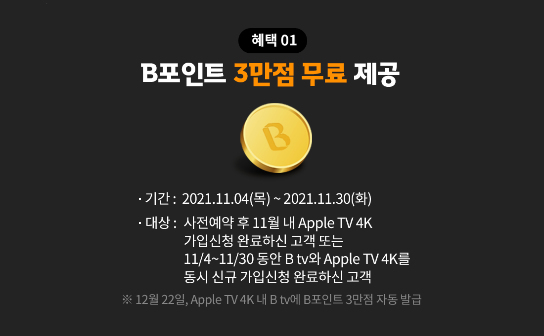 11월 내에 B tvApple TV 4K를 동시 신규 가입신청 완료하신 고객님들을 대상으로 B포인트 3만점을 드립니다.