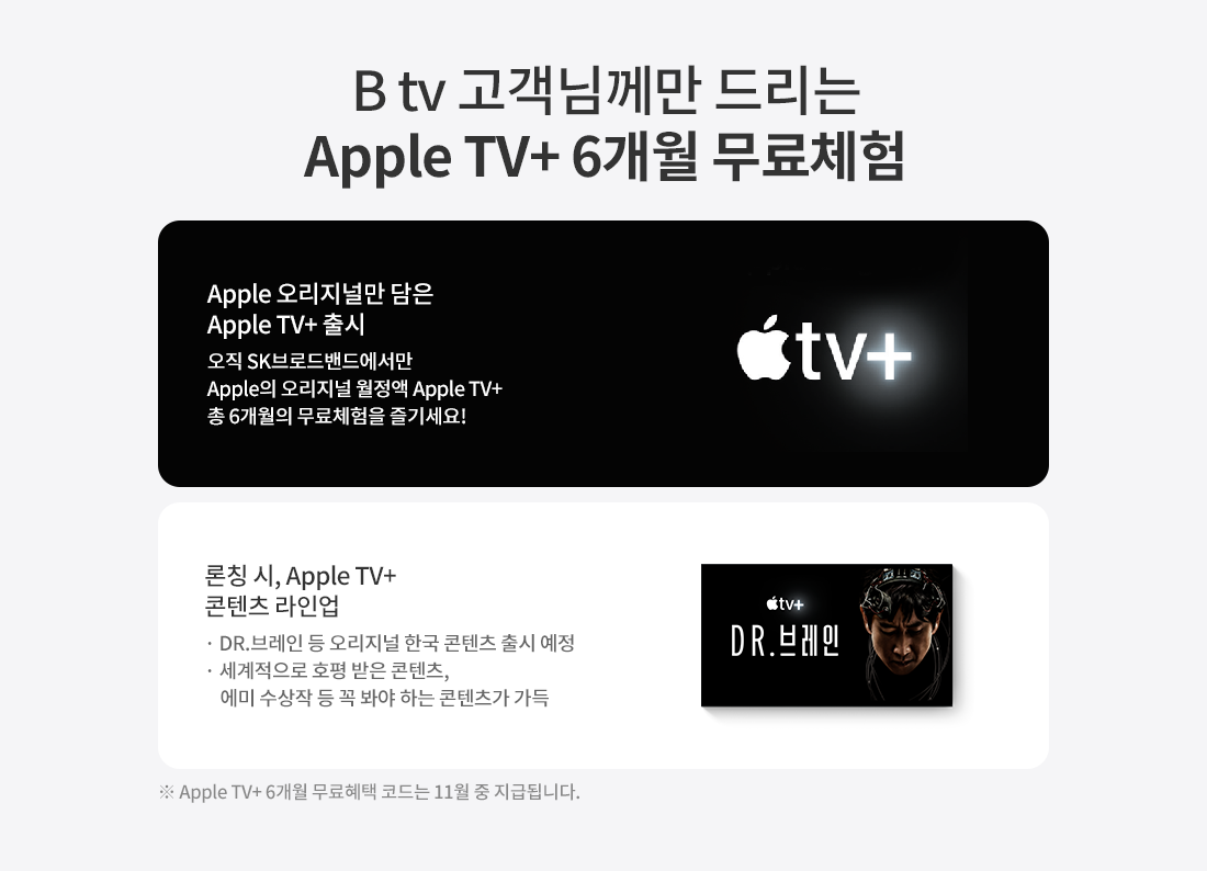 오직 SK브로드밴드에서만 Apple의 오리지널 월정액 Apple TV+를 총 6개월간 무료로 즐기실 수 있습니다.