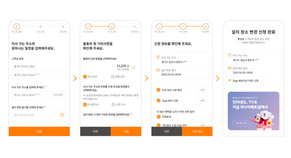 마지막으로 고객명, 이사 신청한 서비스, 변경 주소, 희망 일시를 꼼꼼하게 확인해주세요.