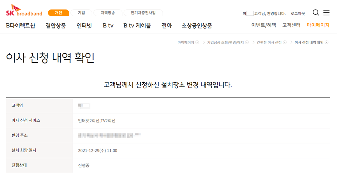 간편한 이사 신청 | 고객센터 | SK브로드밴드 개인