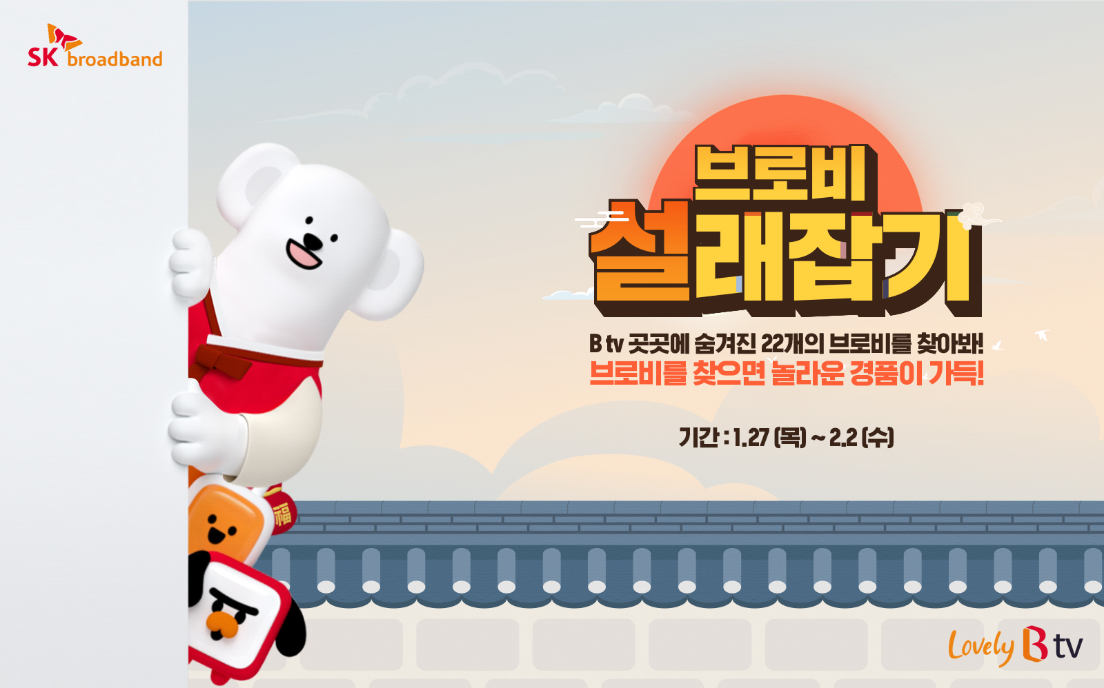 SK브로드밴드(대표이사 사장: 최진환, www.skbroadband.com)가 2022년 임인년 설 연휴를 맞아 B tv 고객들께 다양한 콘텐츠와 푸짐한 선물을 증정하는 ‘브로비 설래잡기’ 이벤트를 진행한다고 27일 밝혔다.