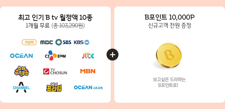 또한 신규 고객 전원 10,000 B포인트를 제공하니 보고 싶었던 유료 프로그램이나 영화도 할인받고 볼 수 있죠!