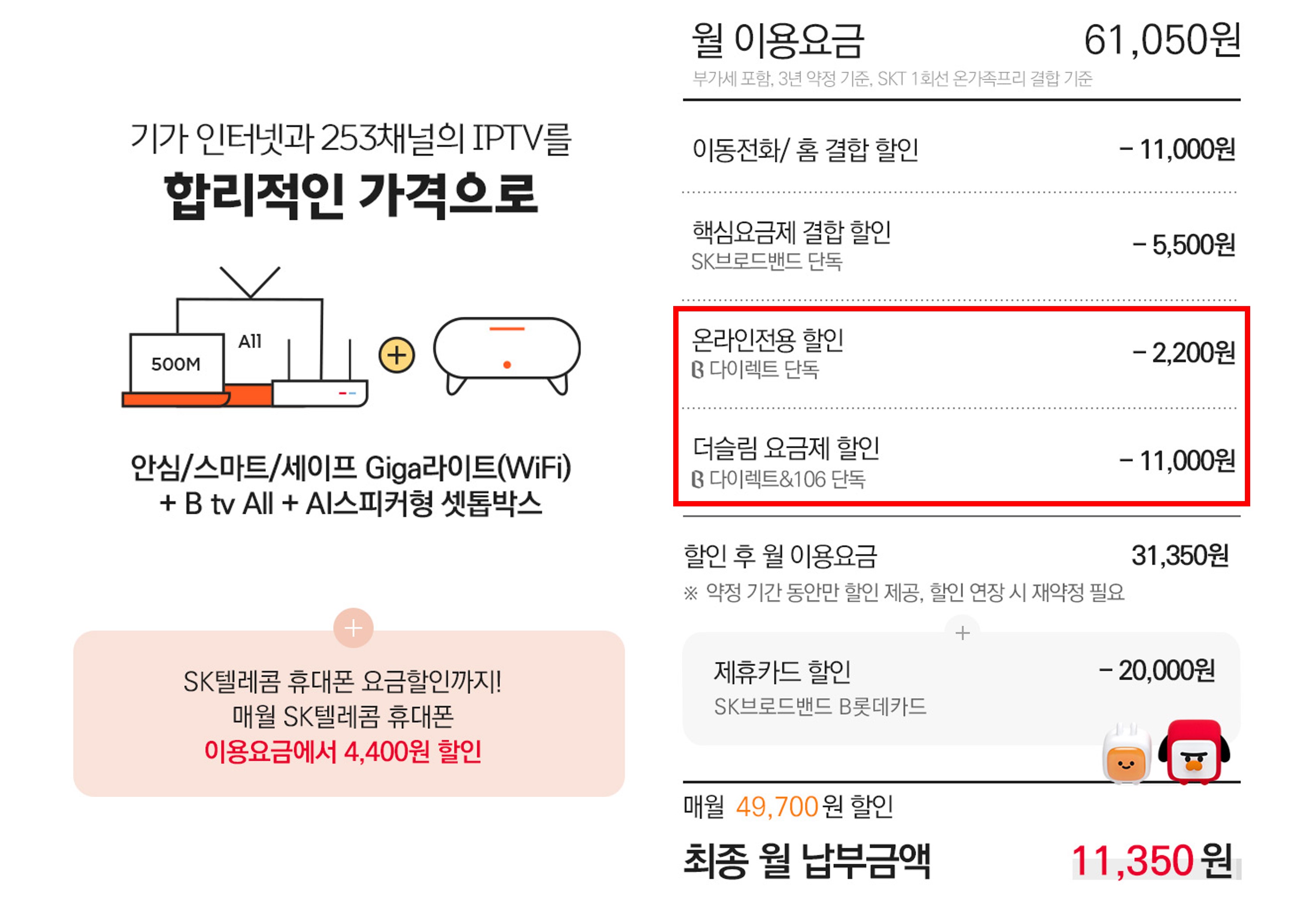 요금 할인 혜택을 선택하시면 매월 11,000원이 할인되는 온라인 전용 ‘더슬림 요금제’가 적용되어, 가입 상품에 따라 매월 최대 49,700원의 할인을 받을 수 있답니다.