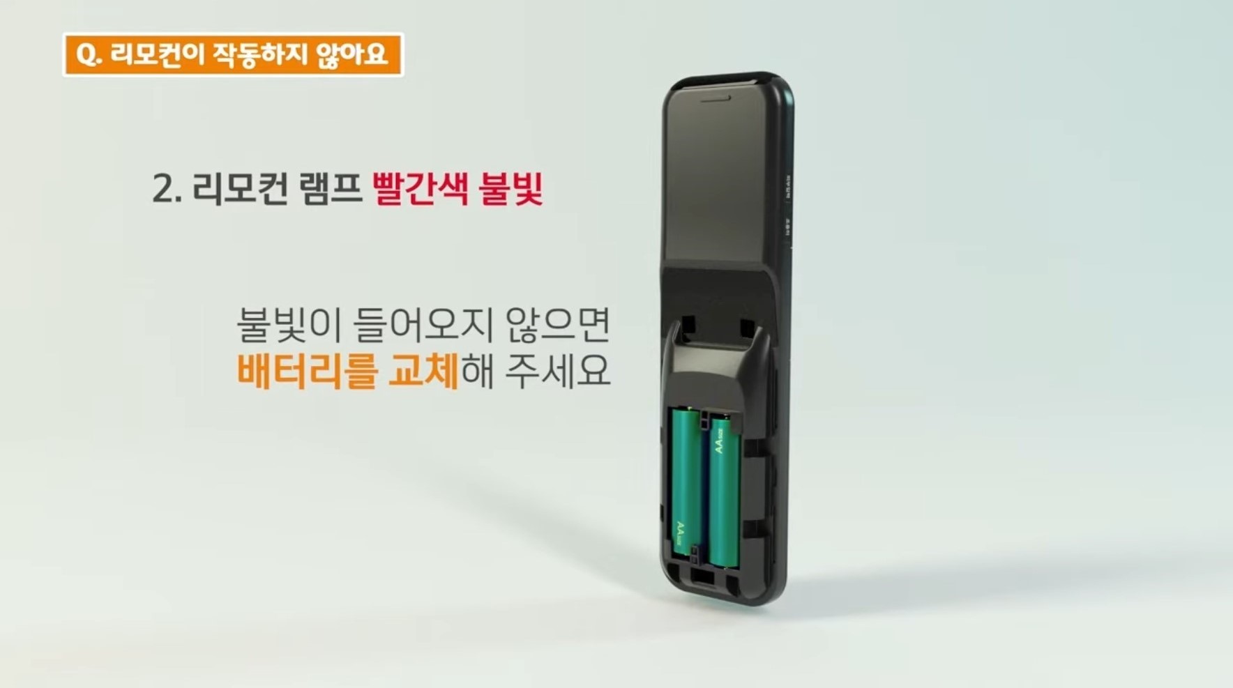 만약 리모컨 위쪽 램프에 빨간색 불빛이 들어오거나 아무런 불빛도 들어오지 않는다면 배터리를 교체해주세요.