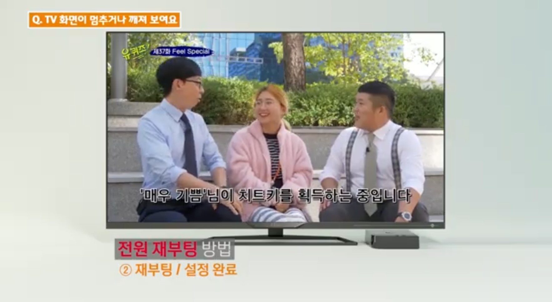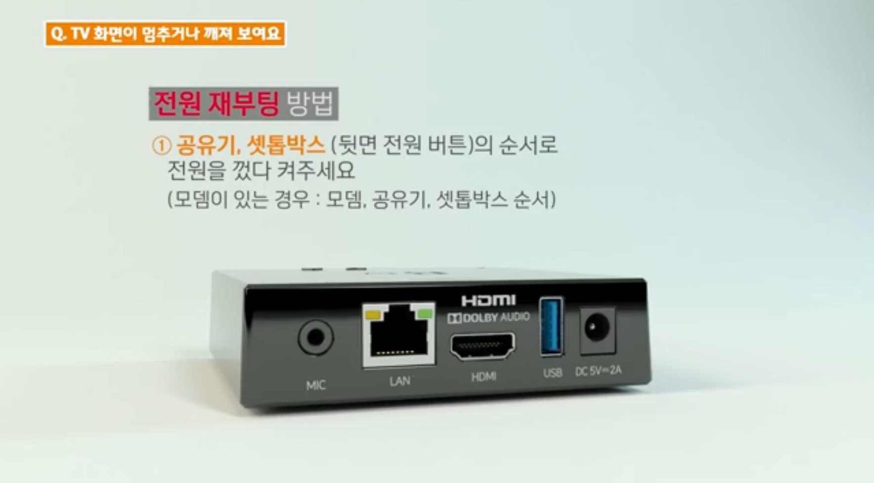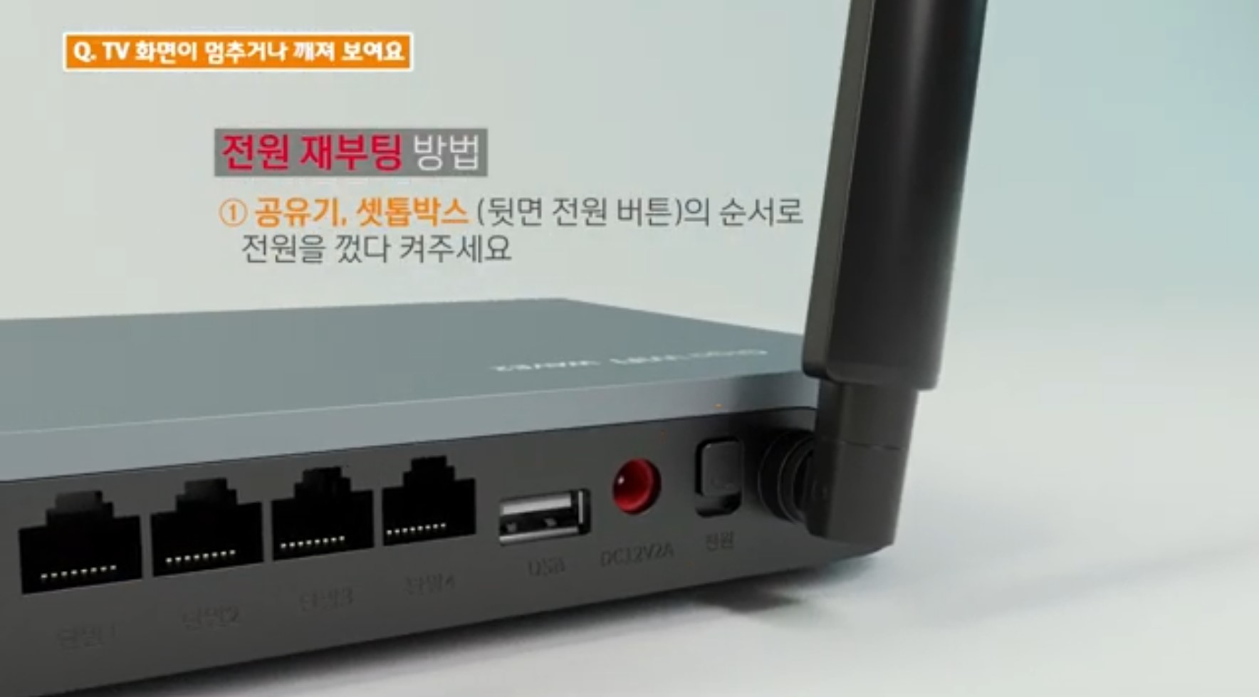 셋톱박스는 뒷면에 있는 전원 어댑터 선을 뺏다 꽂아주세요.
