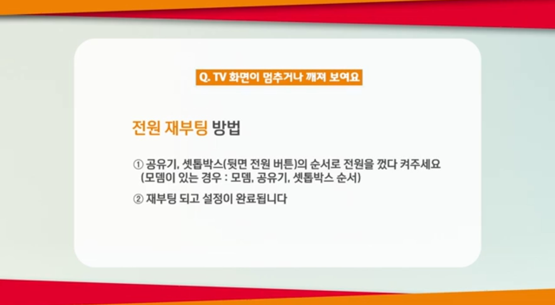 공유기와 셋톱박스의 순서로 전원을 껏다 켜주세요.