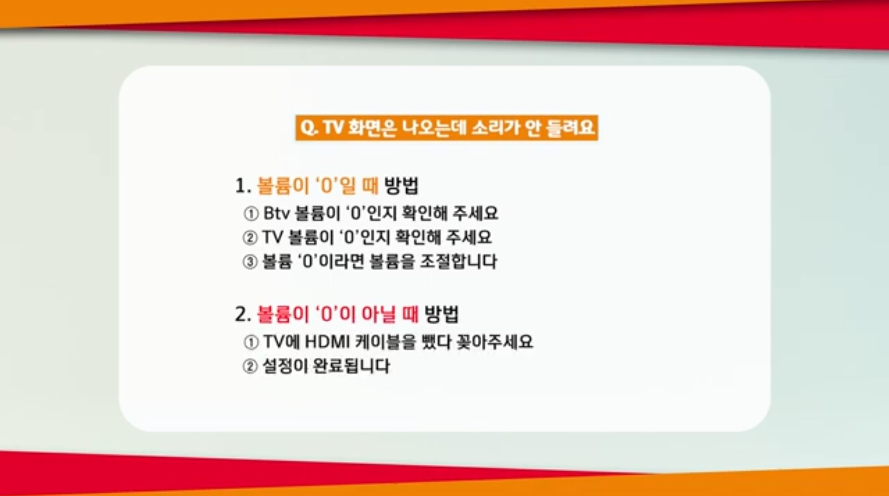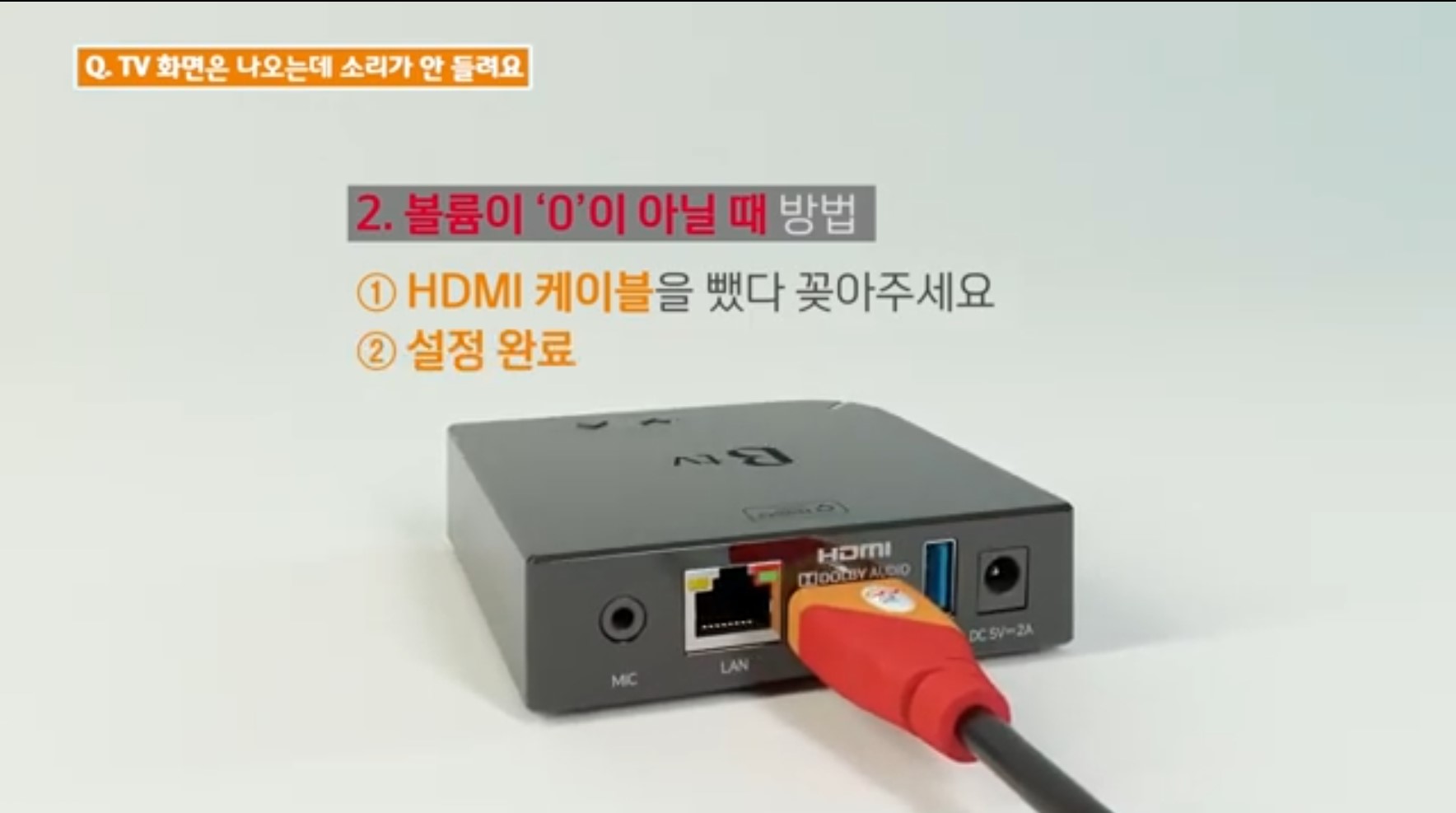 볼륨이 '0'이 아닌데도 소리가 들리지 않는다면 셋톱박스와 TV를 연결 하는 HDMI 케이블을 뺏다가 꽂아주세요.