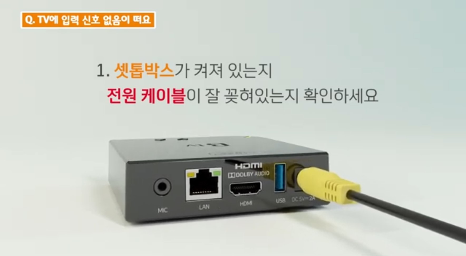 먼저 셋톱박스가 켜져있는지 전원케이블은 잘 연결되어 있는지 확인하세요.